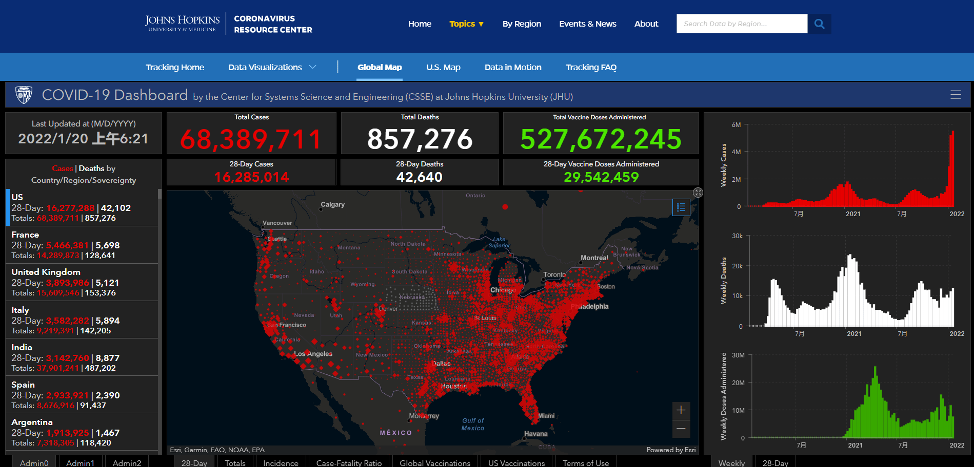 (观察者网讯)根据美国约翰斯·霍普金斯大学统计数据,截至北京时间2022年1月20日6时21分,美国新冠肺炎累计确诊病例达到68389711例,累计死亡病例达到857276例。在过去约24小时里,美国新增确诊病例1217416例,新增死亡病例3867例。