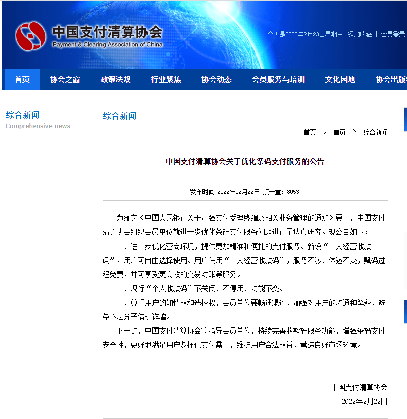 据中国支付清算协会网站消息,2月22日当天,中国支付清算协会发布关于优化条码支付服务的公告。