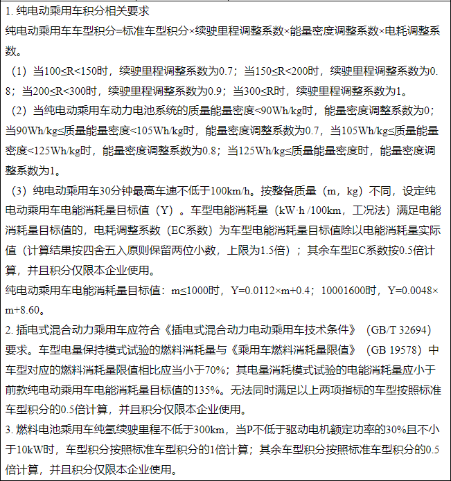 (一)调整新能源车型积分计算方法。综合考虑技术进步、成本下降和积分合规成本变化情况,按照积分供需平衡原则,调整《积分办法》附件2《新能源乘用车车型积分计算方法》,将新能源乘用车标准车型分值平均下调40%左右,并相应调整了积分计算方法和分值上限。同时,考虑到后续新能源积分比例和分值要求仍需要根据实际情况不断进行修改,《决定》规定工业和信息化部可以根据实际情况及时对《新能源乘用车车型积分计算方法》作出调整。