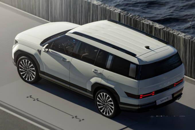 全新一代SANTA FE采用现代最新的设计语言,整体造型偏向硬派SUV,已无现款车型身影。前脸采用贯穿式日间行车灯,并搭配H形前大灯组,整体造型更加科幻。车侧线条硬朗,前后轮眉微微凸起,并配备当下流行的悬浮式车顶设计,车尾采用垂直的尾箱造型,H形尾灯与头灯相呼应。