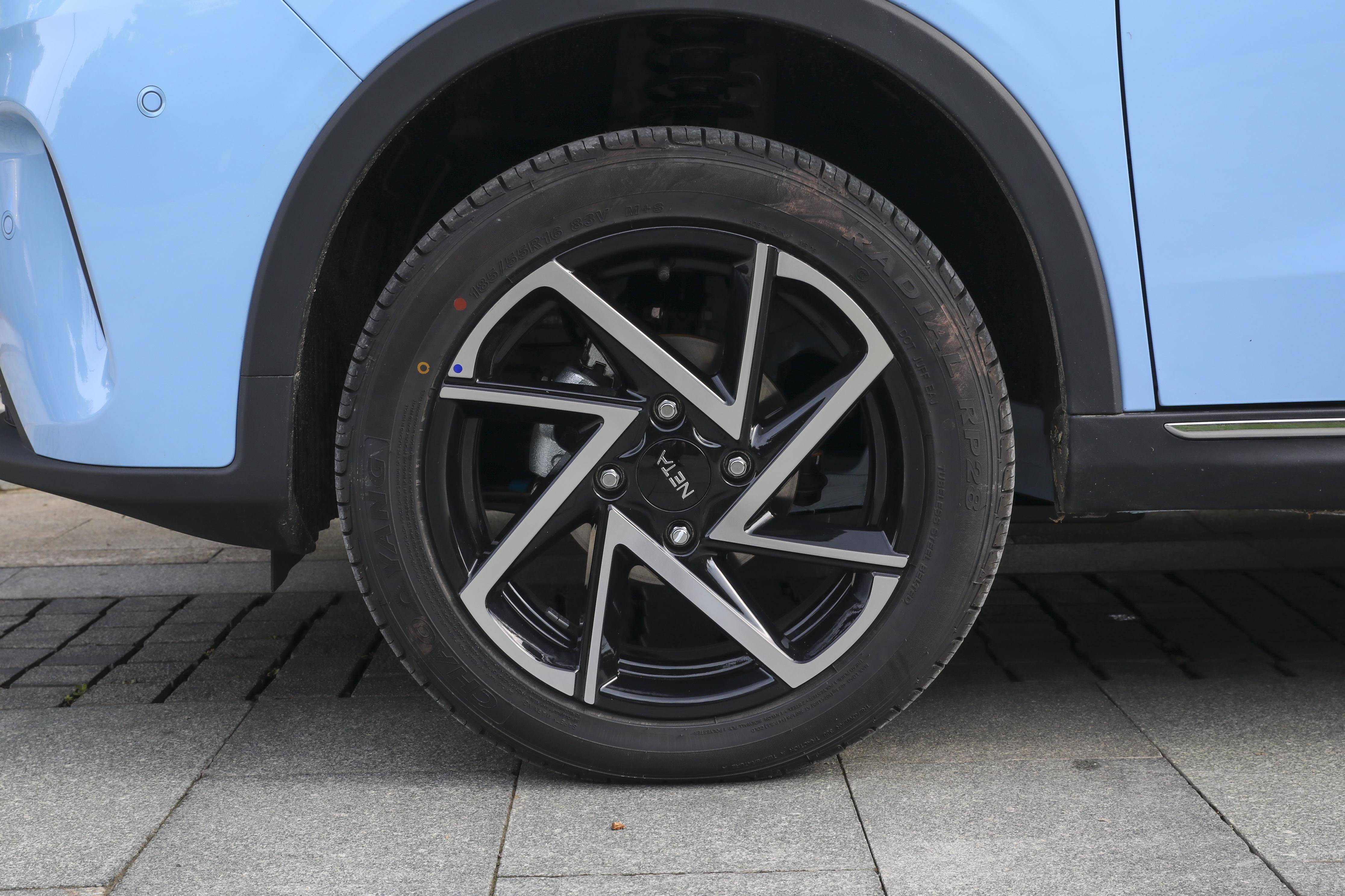 来到车身侧面,双色车身设计,悬浮式车顶搭配溜背造型,充电口位于前车轮的上方,传统门把手的下方还有一处平行四边形的内凹槽,侧裙则是黑色包边来设计。车身尺寸长4070mm、宽1690mm、高1540mm、轴距2420mm。