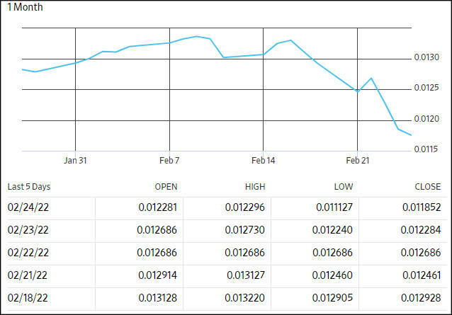 卢布兑美元汇率持续走低 美国《华尔街日报》统计截图