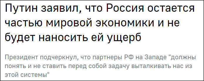 对于俄罗斯工商界人士的担忧,普京表示,俄罗斯仍然是世界经济的一部分,俄方不会对全球经济系统造成损害。