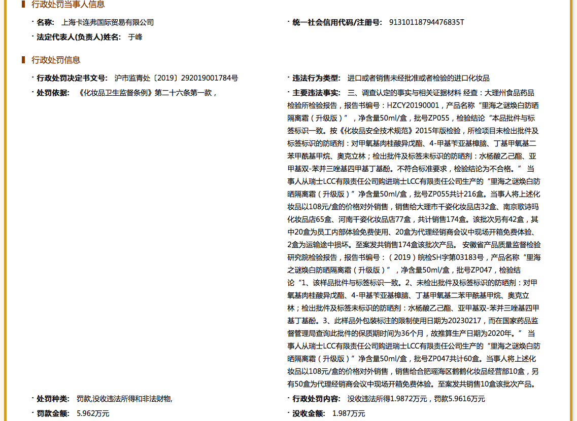 同时,早在2019年11月,该公司因同一理由受到行政处罚。根据国家企业信用信息公示系统,2019年11月,上海卡连弗国际贸易有限公司所经销的一批产品名称为里海之谜焕白防晒隔离霜(升级版)、规格为50毫升的产品,检出批件及标签标识的防晒剂:对甲氧基肉桂酸异戊酯、4-甲基苄亚基樟脑、丁基甲氧基二苯甲酰基甲烷、奥克立林;检出批件及标签未标识的防晒剂:水杨酸乙己酯、亚甲基双-苯并三唑基四甲基丁基酚。不符合标准要求,检验结论为不合格。
