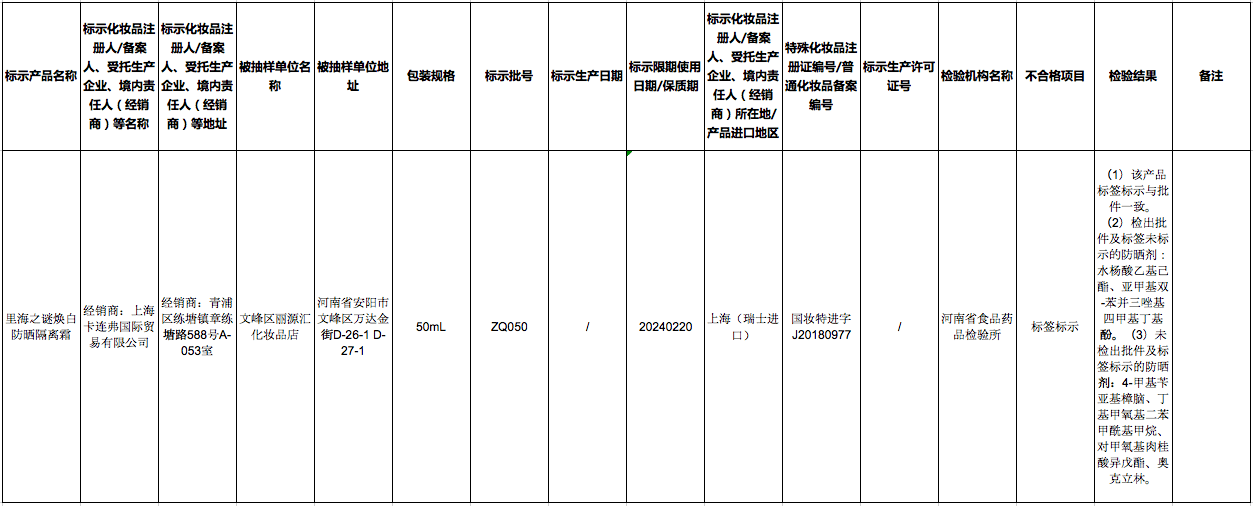 此次公布的不符合规定化妆品中。有一批次标示经销商为上海卡连弗国际贸易有限公司,标称为里海之谜焕白防晒隔离霜、规格为50毫升、批准文号/备案号为国妆特进字J20180977的产品,被检出批件与标签未标示的防晒剂:水杨酸乙基己酯、亚甲基双-苯并三唑基四甲基丁基酚;同时,未检出批件及标签标示的防晒剂:4-甲基苄亚基樟脑、丁基甲氧基二苯甲酰基甲烷、对甲氧基肉桂酸异戊酯、奥克立林。