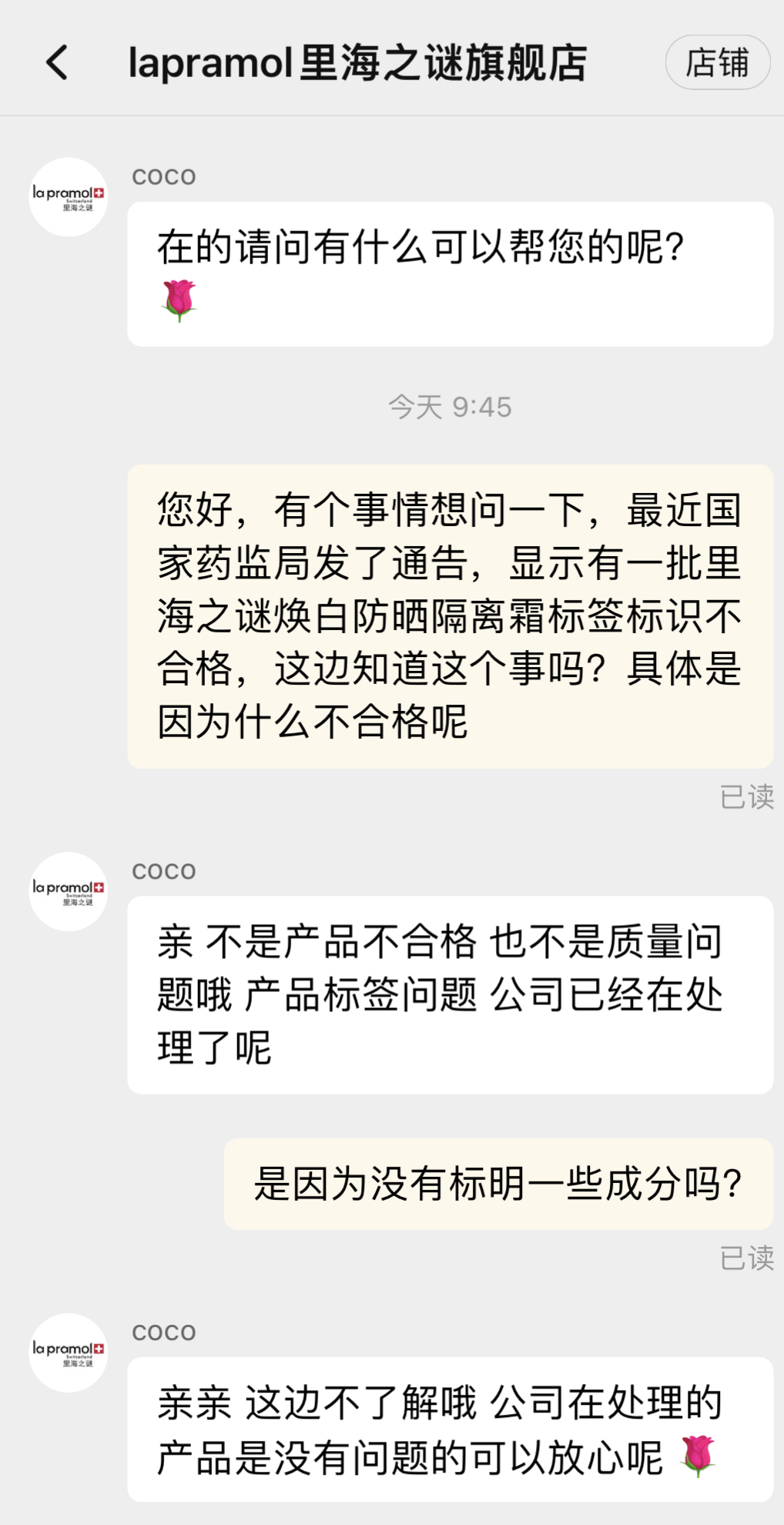2月23日,南都记者通过里海之谜淘宝官方旗舰店联系到客服,客服表示产品没有质量问题,而标签问题目前公司已在处理,具体情况不太了解。目前,在官方旗舰店内已无法搜索到里海之谜焕白防晒隔离霜这一商品。