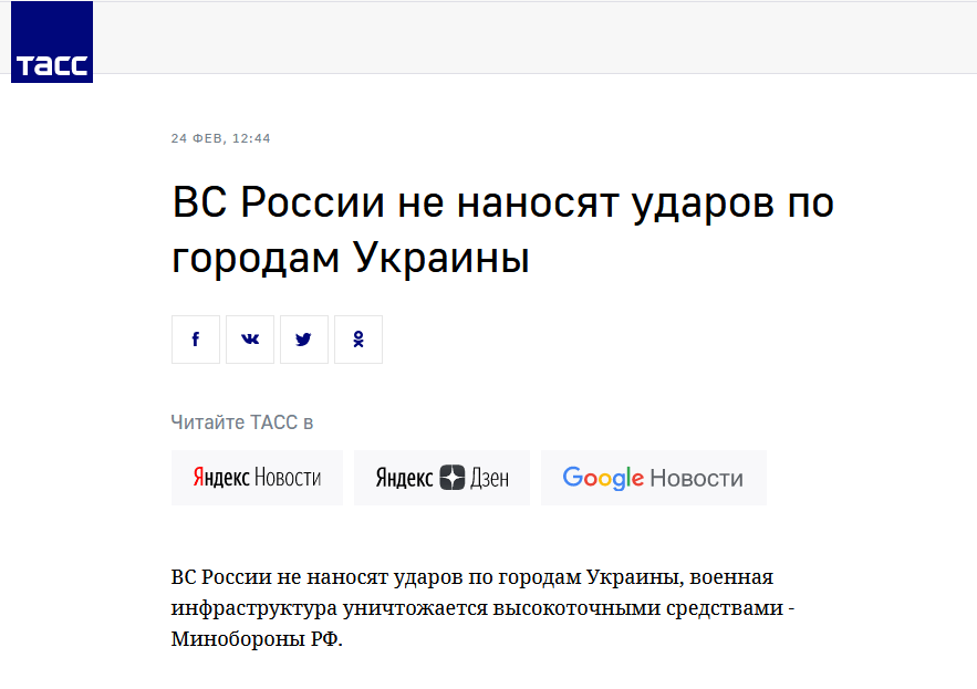 (观察者网讯)俄罗斯塔斯社24日报道,俄罗斯国防部发布消息称,乌克兰军队的军事基础目标、防空目标、军用机场和航空目标均被被高精度武器破坏,俄罗斯军队不会使用导弹、飞机或火炮对乌克兰城市进行袭击,对乌克兰的打击未危及平民安全。